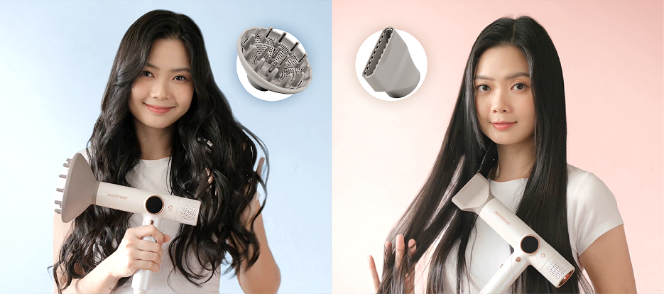 Tingkatkan rutinitas pengeringan rambut Anda dengan dua aksesori bawaan. Nozel konsentrator memberikan aliran udara terarah untuk pengeringan lebih cepat dan hasil lurus yang lebih rapi saat menggunakan sisir. Diffuser menjaga rambut keriting dan bergelombang tetap bervolume serta mengurangi kekusutan.
