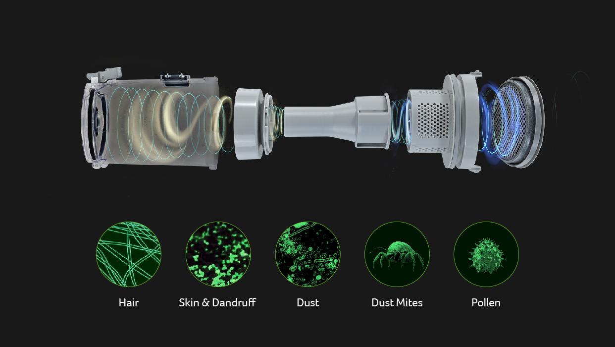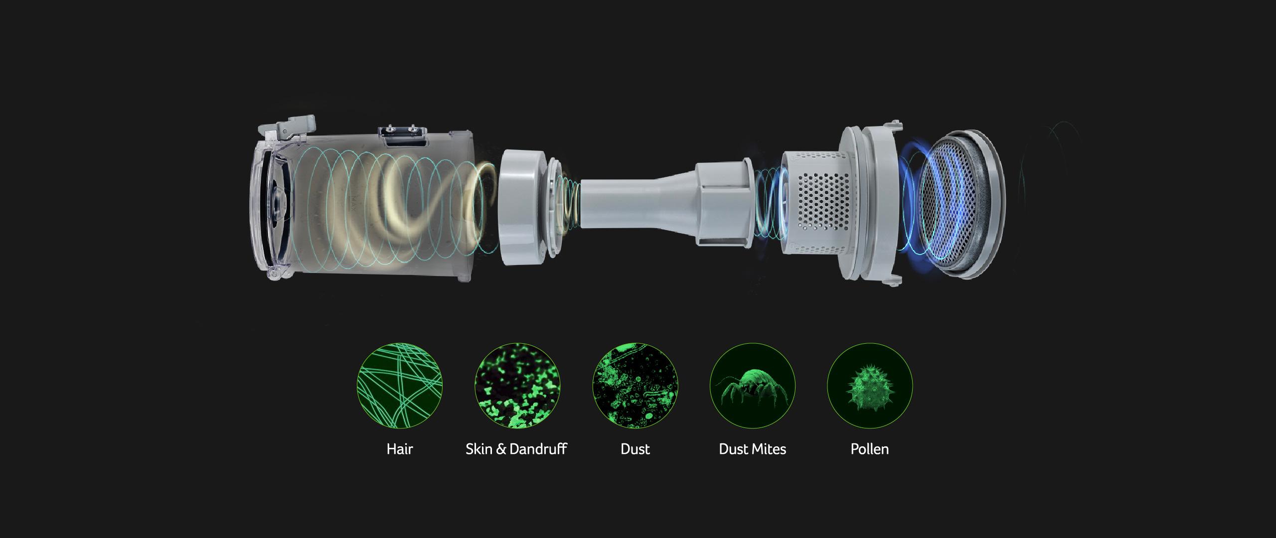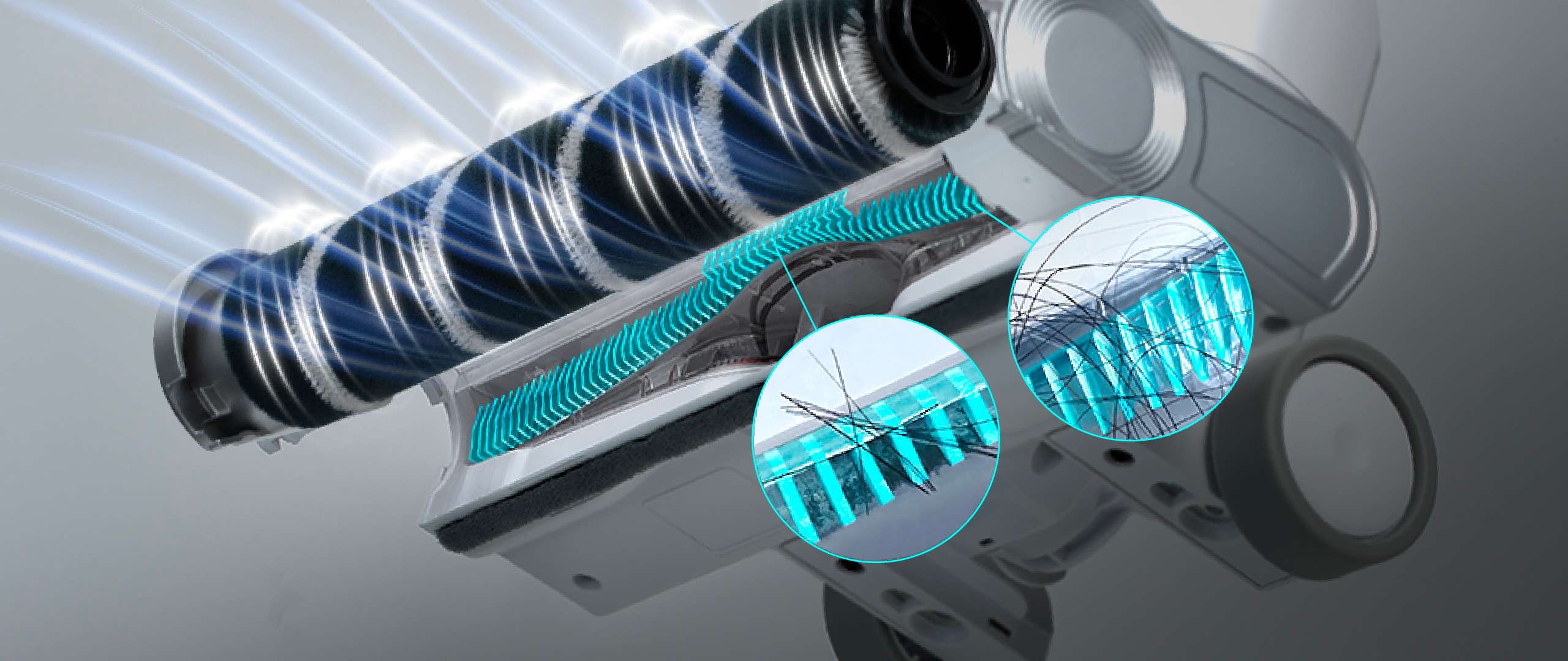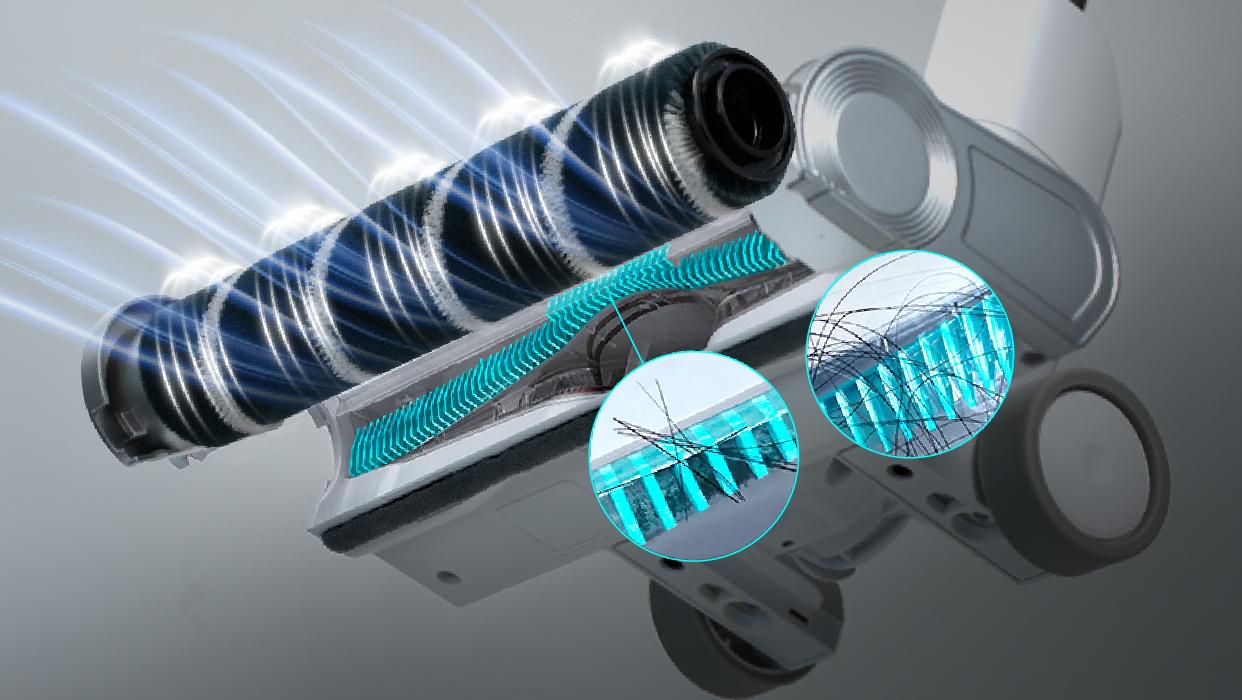 Dilengkapi teknologi anti-rambut terbaru dan sisir berbentuk V, vacuum ini membersihkan secara optimal tanpa khawatir rambut panjang, rambut pendek, maupun bulu hewan peliharaan tersangkut di dalam mesin.