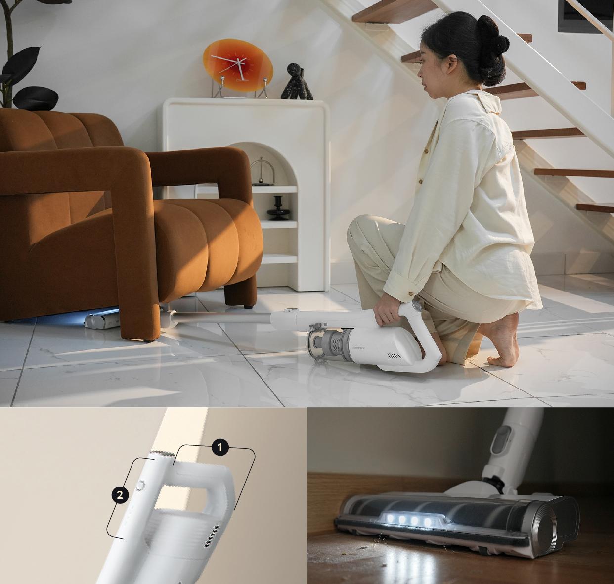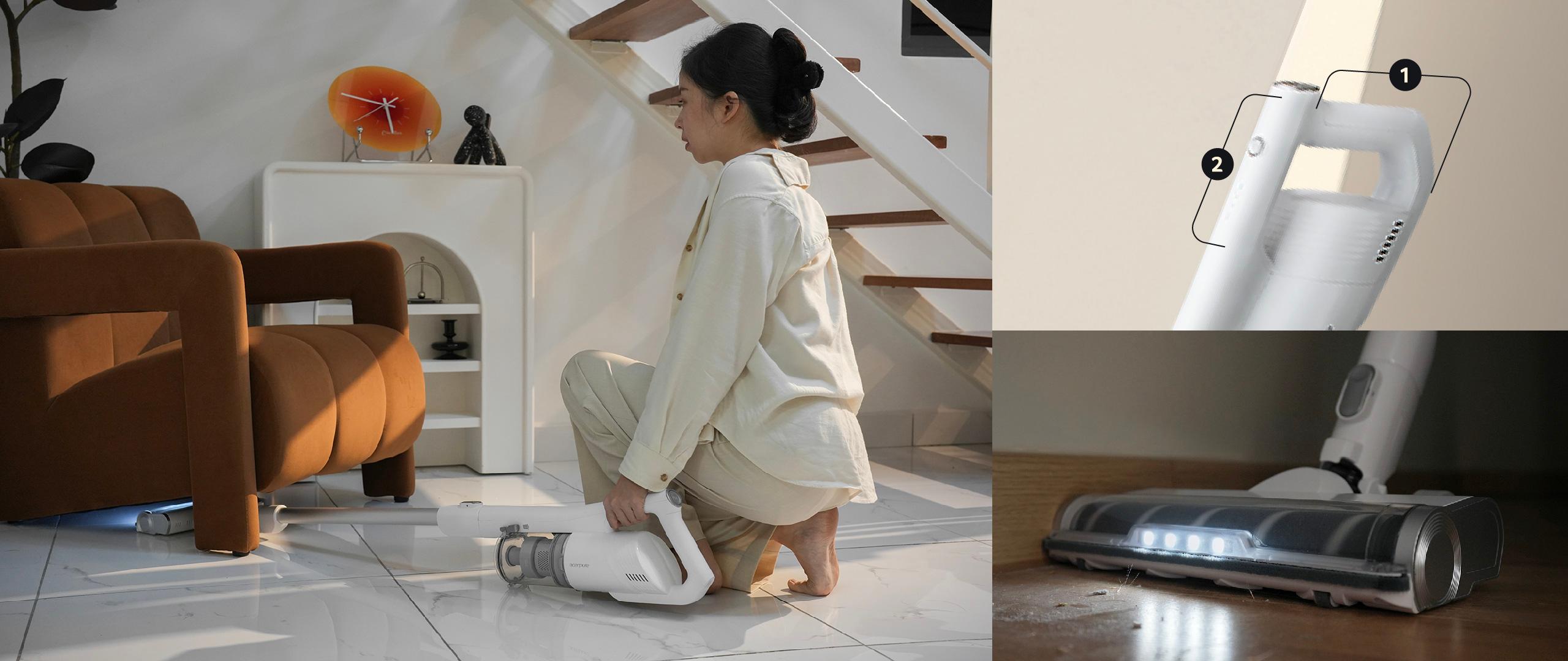 Pegangan 2-arah khusus memberikan handling yang lebih stabil dan kontrol tanpa usaha, memudahkan Anda bergerak ke kiri dan kanan, meluncur di berbagai permukaan, serta berganti arah dengan lancar. Dilengkapi 4 lampu LED bawaan pada sikat utama yang menerangi jalur pembersihan, sehingga debu tersembunyi di sudut gelap dapat dibersihkan dengan mudah.