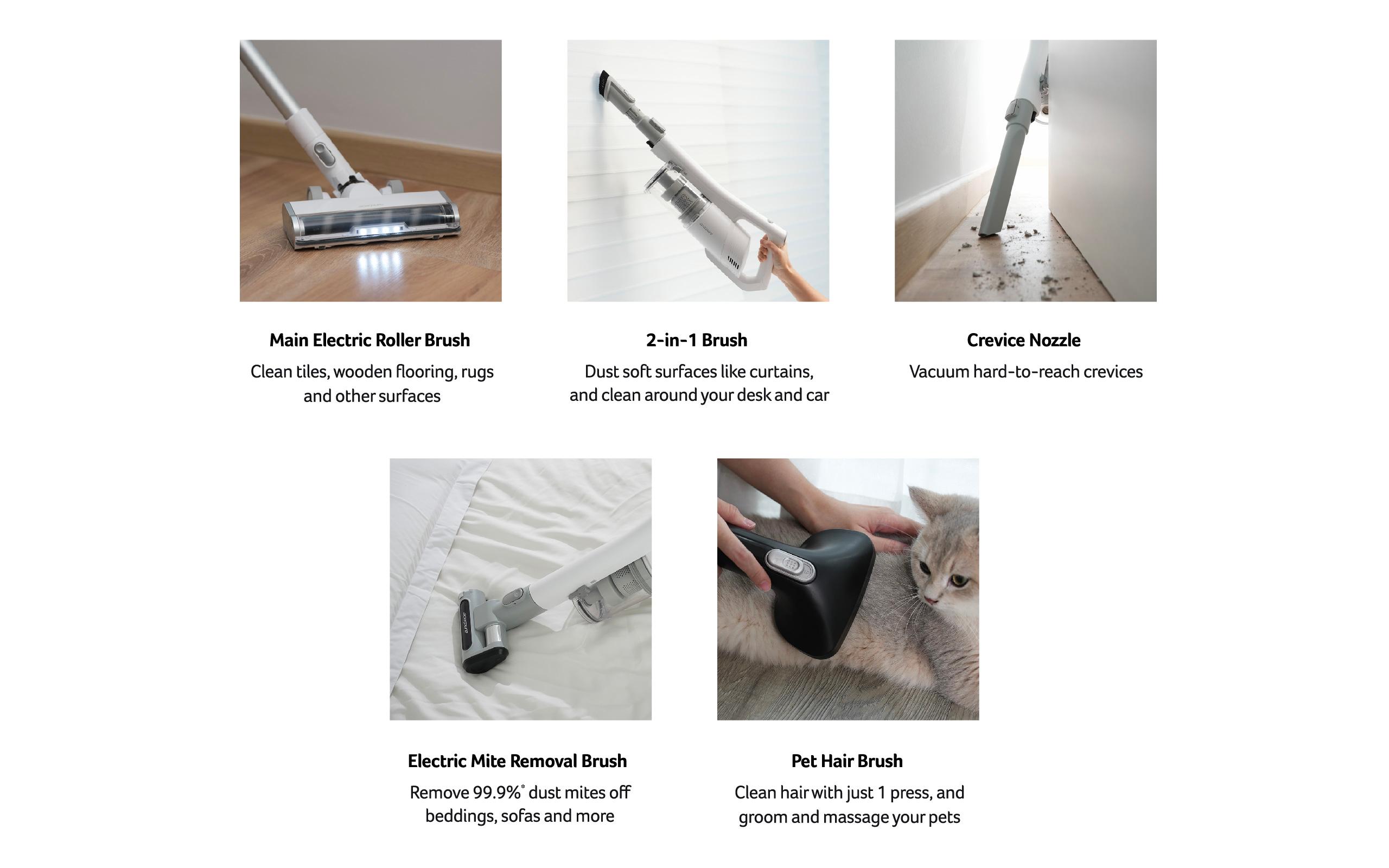 Baik untuk membersihkan karpet, sofa, maupun area yang sulit dijangkau, 5 sikat yang dapat diganti memastikan pembersihan menyeluruh di seluruh rumah Anda. Bahkan, Anda juga dapat merawat bulu hewan peliharaan dengan sikat khusus yang dirancang khusus untuk bulu hewan.