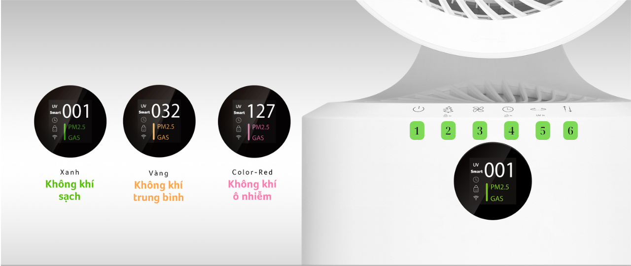 - Dùng để chuyển đổi giữa các chế độ lọc không khí, gồm 5 chế độ Smart, 1, 2, 3, Turbo. Trong đó, ở chế độ Smart, thiết bị sẽ tự động điều chỉnh chế độ lọc không khí phù hợp nhất với chất lượng không khí của môi trường xung quanh, giúp tối ưu nhất hiệu quả lọc không khí.