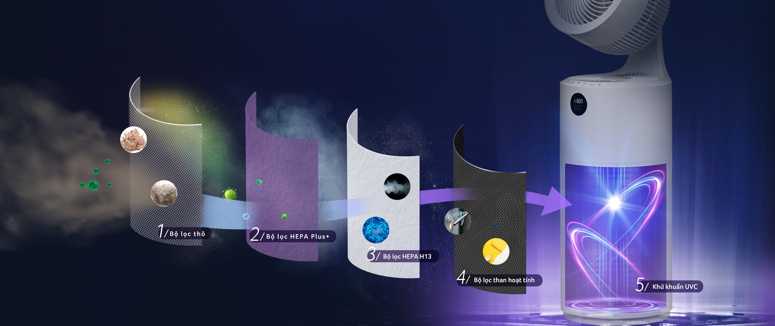 Acerpure Cool C2-UVC có 2 động cơ, một động cơ ở thân máy đảm nhận vai trò hút không khí qua bộ lọc, giúp lọc sạch không khí; động cơ thứ hai nằm ở sau cánh quạt đối lưu, giúp tạo luồng gió mát đi xung quanh không gian phòng. Cả 2 động cơ này đều là động cơ DC-inverter tiết kiệm điện (có khả năng tiết kiệm điện hiệu quả đến 50% so với các loại động cơ thông thường). Máy lọc không khí Acerpure Cool C2-UVC được trang bị bộ lọc HEPA Plus+ độc quyền, bên cạnh khả năng loại bỏ đến 99.97% bụi siêu mịn PM1.0, PM2.5 và các thành phần lơ lửng trong không khí có kích thước nhỏ đến 0.3 micromet, bộ lọc này còn được kiểm chứng cho khả năng loại bỏ đến >99% virus HCov-229E, virus cúm A (H1N1), mùi hôi và các loại vi khuẩn khác.